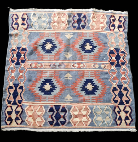 • Kilim persa, trabalho artesanal em lã sobre algodão.Apresenta composição geométrica típica dos kilims tribais, com campo estruturado em faixas horizontais que alternam motivos romboidais, ganchos estilizados e padrões em zigue-zague. A paleta suave, em tons de azul, rosa antigo, creme e azul-marinho, confere leveza ao desenho e reforça o caráter decorativo da peça. A técnica plana (flat weave) evidencia a precisão das linhas e a clareza dos motivos tradicionais da tecelagem persa.Exemplar de boa presença visual, representativo dos kilims do Irã, valorizados pela simplicidade geométrica e harmonia cromática. Dimensões: 1,22x1,26