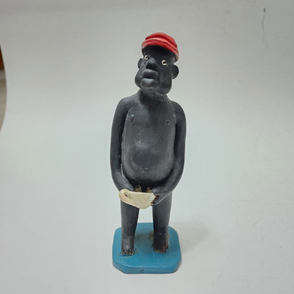 • Escultura brasileira de Ernestina, cerâmica modelada e policromada.Figura masculina estilizada, de postura frontal, modelada em traços ingênuos característicos da produção de Ernestina. O personagem, de corpo alongado e volumes simplificados, apresenta expressão serena, usando boné vermelho e segurando pequeno recipiente nas mãos. A base em tom azul reforça o caráter decorativo da peça. Policromia original preservada, com assinatura ERNEST. incisa no verso.Exemplar representativo do artesanato figurativo popular brasileiro, destacando-se pela simplicidade formal, presença expressiva e linguagem escultórica singular da artista. Dimensões 20 x 7x7 centímetros