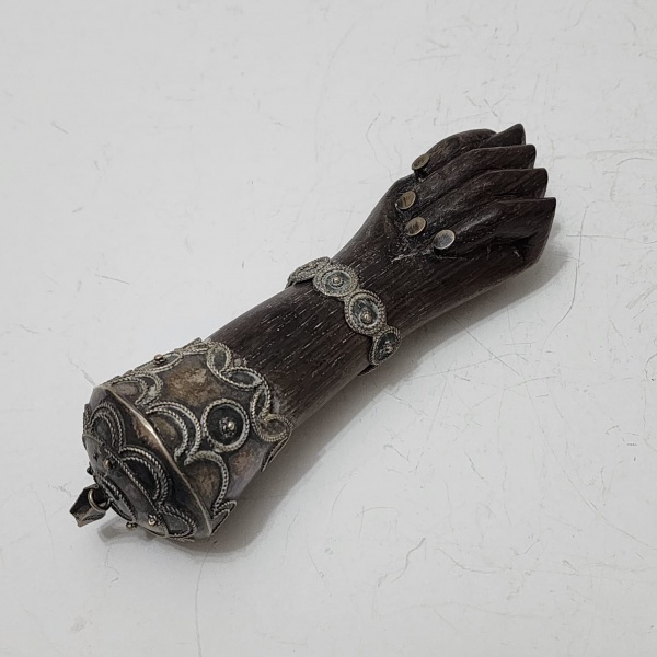 • Figa amuleto em jacarandá e prata de lei, joia de crioula, expressão da cultura afro-brasileira.Amuleto tradicional de proteção, esculpido em jacarandá maciço no formato de mão fechada, símbolo amplamente associado às práticas apotropaicas de matriz africana no Brasil. A peça recebe ornamentos em prata de lei cinzelada, formando pulseira e terminações decorativas em motivos circulares e geométricos, característicos das chamadas joias de crioula, utilizadas por mulheres negras e afrodescendentes nos séculos XVIII e XIX como marcadores de identidade, devoção e status.A patina antiga sobre madeira e metal reforça a autenticidade do exemplar, que representa de modo significativo o encontro entre tradições africanas e a ourivesaria luso-brasileira.Peça de alto interesse etnográfico, colecionável e histórica dentro do repertório da cultura afro no Brasil. Dimensões: 17 centímetros.