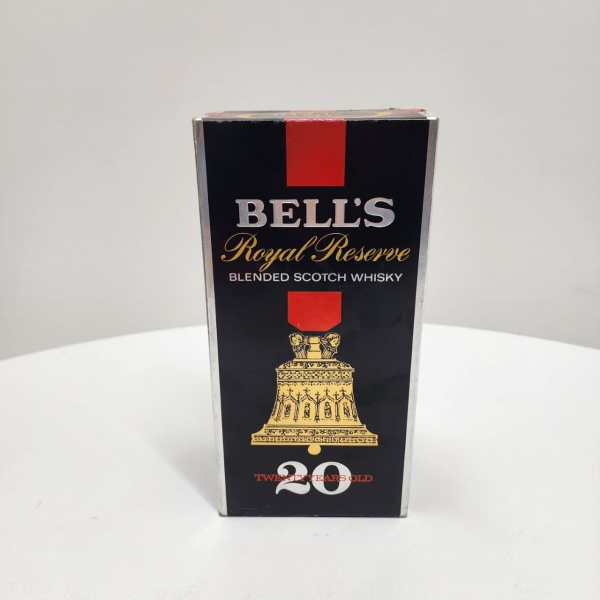 • BELLS  ROYAL RESERVE Blended Scotch Whisky  20 Years Old  43% vol, 750mlGarrafa original Bells Royal Reserve, edição envelhecida 20 anos, apresentada em frasco quadriforme característico, com rótulo frontal em preto e dourado trazendo o brasão tradicional da destilaria. Graduação alcoólica 43% vol. (formato antigo, hoje descontinuado).Acompanha caixa original de época, em preto com detalhes vermelhos e dourados, apresentando o icônico sino dourado que identifica a linha Royal Reserve. O conjunto encontra-se em excelente estado de conservação, com lacre superior íntegro e conteúdo completo. Whisky escocês 100% blended, produzido e engarrafado pela Arthur Bell & Sons Ltd., Perth, Scotland, uma das casas mais tradicionais da Escócia, estabelecida em 1825.
