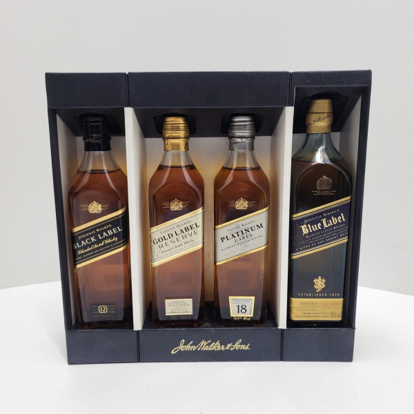 • JOHNNIE WALKER  COLLECTION SETBlack Label 12 anos  Gold Label Reserve  Platinum Label 18 anos  Blue Label4 garrafas  200 ml cada Conjunto oficial Johnnie Walker Collection, apresentado em estojo rígido original com acabamento em preto fosco, detalhes metalizados e indicação das quatro garrafas. O interior contém :Johnnie Walker Black Label  12 Years Old  200 mlBlended Scotch Whisky clássico, reconhecido mundialmente .Johnnie Walker Gold Label Reserve  200 ml Blend premium, com perfil suave e melado. Johnnie Walker Platinum Label  18 Years Old  200 ml Versão superior, envelhecida 18 anos, hoje descontinuada nesta nomenclatura. Johnnie Walker Blue Label  200 ml Expressão de luxo da marca, produzida em pequenos lotes.