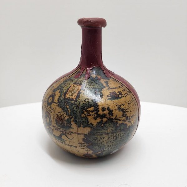 • GARRAFA GLOBO CARTOGRÁFICO  ITÁLIA Brandy Italiano  Década de 19701990  Lacrada Garrafa decorativa italiana em formato de globo terrestre, revestida com mapa cartográfico em estilo renascentista, com verniz protetor. Acabamento superior e inferior em material sintético texturizado na cor vinho. Tampa original em cortiça lacrada com cera vermelha, apresentando desgaste natural do tempo, mas mantendo a selagem original. Modelo produzido por destilarias italianas entre as décadas de 70 e 90, utilizado principalmente para envase de brandy italiano,