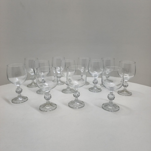 • Conjunto composto por 12 taças para vinho branco em cristal transparente, todas com corpo liso e haste ornamentada por esfera facetada, detalhe clássico de lapidação decorativa. Base com leve faceteamento radial, produzindo discreto brilho sob a luz. Dimensões:15x7centímetros.