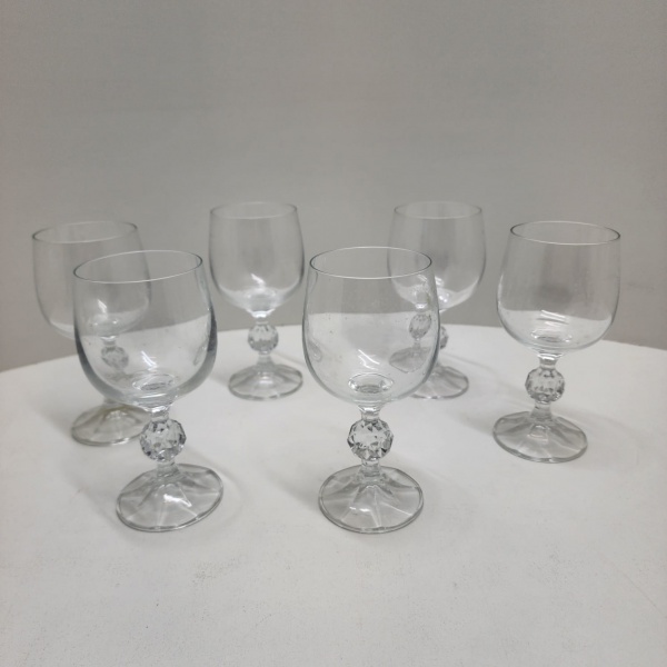 • Conjunto composto por 6 taças para vinho branco em cristal transparente, todas com corpo liso e haste ornamentada por esfera facetada, detalhe clássico de lapidação decorativa. Base com leve faceteamento radial, produzindo discreto brilho sob a luz. Dimensões:15x7centímetros.