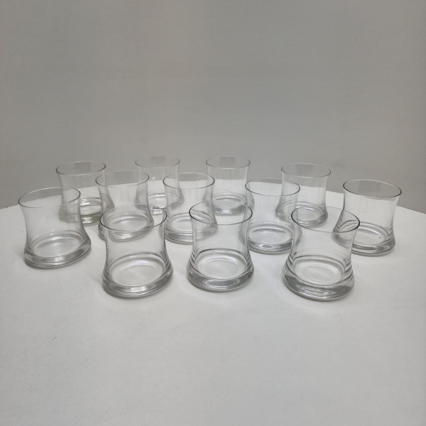 • Conjunto composto por doze copos baixos (old fashioned) em cristal transparente. Peças de parede espessa e base reforçada com rebaixo circular, apresentando brilho limpo e boa sonoridade. Design contemporâneo, ideal para whisky, drinks on the rocks.