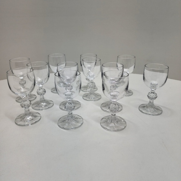 • Conjunto composto por 14 taças para vinho porto em cristal transparente, todas com corpo liso e haste ornamentada por esfera facetada, detalhe clássico de lapidação decorativa. Base com leve faceteamento radial, produzindo discreto brilho sob a luz. Dimensões:14x7centímetros.