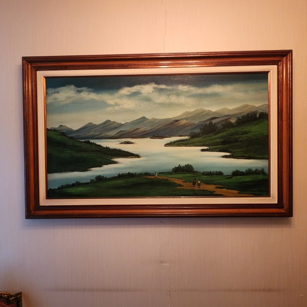 • Alberto Matera (19392016), óleo sobre tela, intitulado Contemplando o Infinito, datado de 1987. Paisagem serena e profundamente atmosférica do artista brasileiro Alberto Matera, reconhecido por suas composições bucólicas de montanhas, lagos e horizontes amplos. Nesta obra, intitulada Contemplando o Infinito, Matera apresenta um panorama de montanhas azuladas ao fundo, com espelho dágua sinuoso e áreas de vegetação verde intensa, acompanhadas de pequenas figuras humanas que reforçam a escala monumental da natureza. Dimensões:0,80x1,20