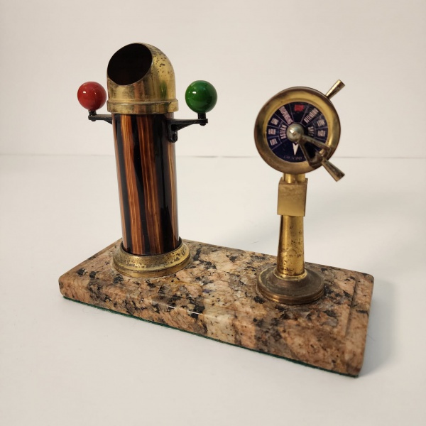 • Conjunto decorativo de inspiração náutica composto por bússola protegida por cúpula metálica e telégrafo marítimo ornamental com inscrições como Stop, Astern e Ahead, além da marcação London no mostrador. Produzido em metal com pátina natural e apoiado sobre base de granito, é uma peça elegante e pesada, ideal para escritórios, estantes ou coleções temáticas. Medindo: 18x20x10