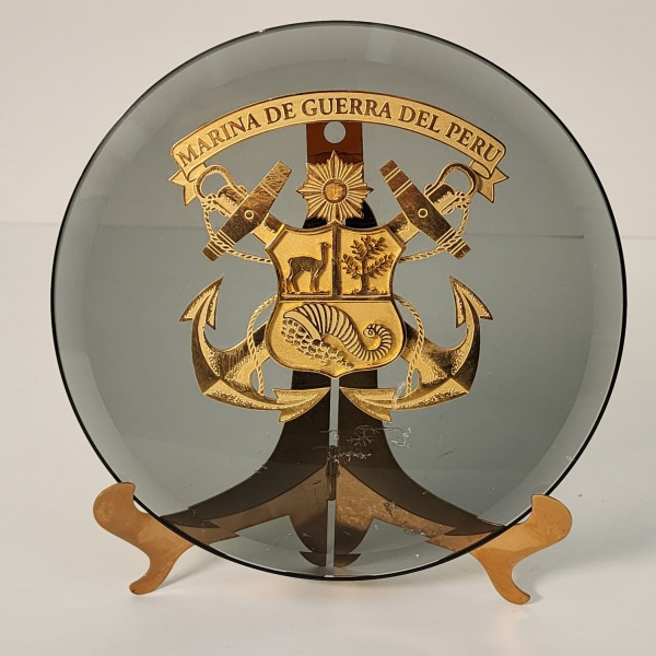 • Descrição: Prato em vidro fumê com aplicação central dourada trazendo o brasão oficial da Marina de Guerra del Perú. O emblema é extremamente detalhado, composto por âncoras cruzadas, canhões, cordas navais e um escudo dividido com símbolos tradicionais do Peru, coroado por uma estrela radiante. Medindo: 22x22