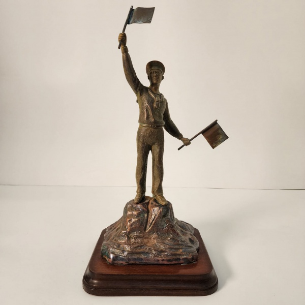 • Elegante escultura em bronze representando um marinheiro em posição de sinalização, segurando duas bandeiras como se orientasse navios à distância. O metal apresenta pátina natural, valorizando os detalhes do uniforme e da base rochosa.