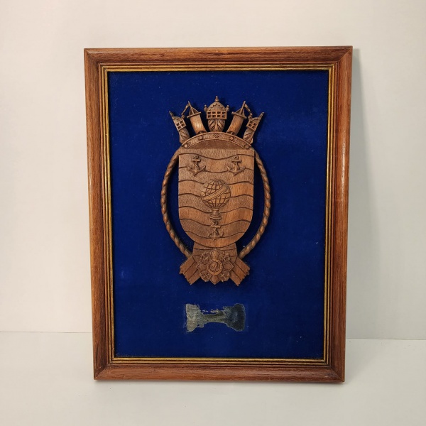 • Peça decorativa composta por um brasão marítimo ricamente entalhado em madeira, exibindo elementos clássicos como âncoras, cordas, embarcações e globo central, símbolos tradicionalmente ligados à navegação e à autoridade naval. Medindo: 38x30