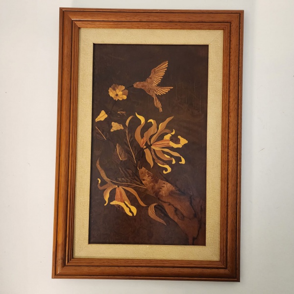 • Elegante quadro decorativo feito na técnica de marchetaria, com lâminas de madeira natural formando a imagem de um beija-flor em voo diante de flores. A peça apresenta belo contraste de tons e ótimo acabamento, trazendo sofisticação e aconchego ao ambiente. Medindo: 46x31