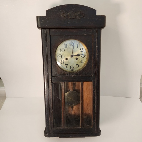 • Este relógio de parede apresenta caixa robusta em madeira escura, com pátina natural que denuncia décadas de histórias silenciosas. O mostrador possui numeração clássica e elegante, protegido por vidro, enquanto o compartimento inferior revela o pêndulo, trazendo aquele charme hipnótico típico dos relógios mecânicos tradicionais. Medindo: 80x35x18