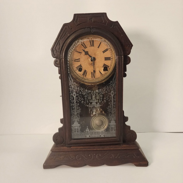• Relógio antigo confeccionado em madeira escura, com mostrador de algarismos romanos e mecanismo mecânico com pêndulo. Possui porta frontal em vidro decorado e detalhes entalhados que reforçam seu estilo clássico. Medindo: 49x33x13