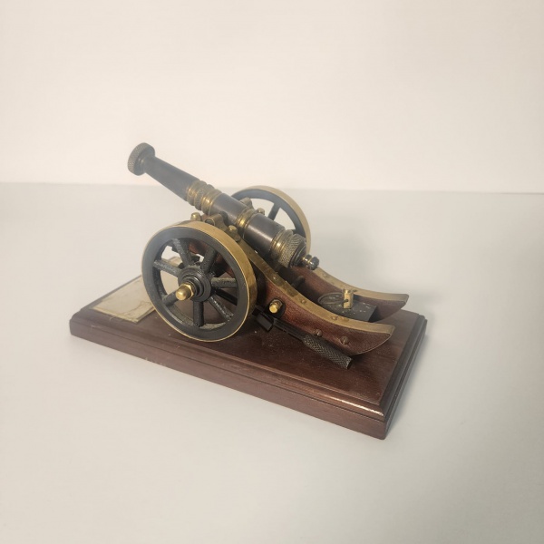 • Elegante miniatura de canhão com estrutura metálica em acabamento escuro e detalhes dourados, apoiada sobre sólida base de madeira polida. Rica em detalhes, a peça evoca as tradições militares e o universo naval. Pertenceu a um almirante da Marinha Brasileira, acrescentando um contexto histórico discreto ao objeto.                                                       Estado de conservação: apresenta leves sinais do tempo e pequenas marcas de manuseio, mantendo excelente aparência geral. Medindo: 13x22x12