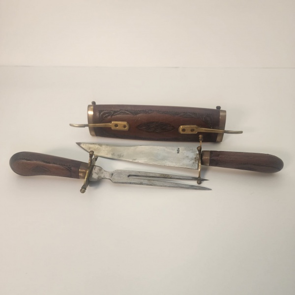 • Conjunto composto por faca e garfo trinchante com cabos em madeira, acompanhado de estojo entalhado com apliques em metal. Apresenta design clássico e funcional, ideal para o preparo e serviço de carnes.                                                                                                                      Estado de conservação: bem preservado, com marcas do tempo na lâmina. Medindo: 7x45x9