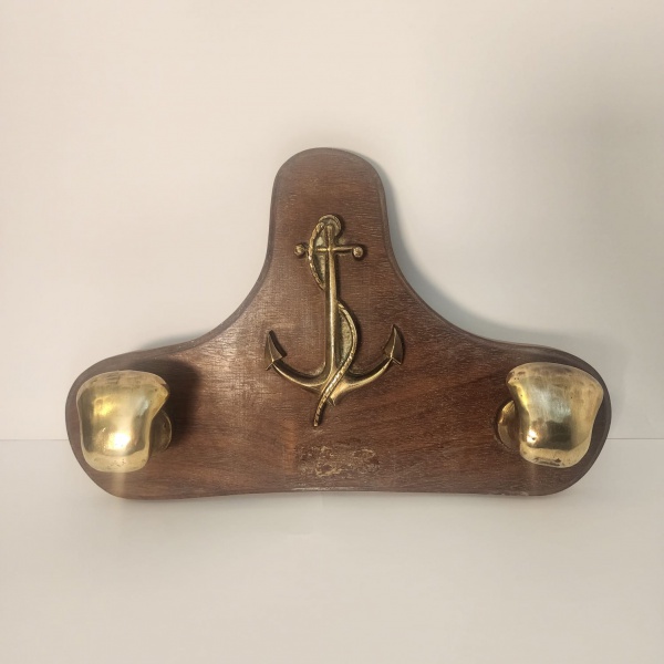 • Cabideiro de parede em madeira com aplicação metálica em formato de âncora e dois suportes frontais em bronze. A peça possui estética náutica clássica, ideal para compor ambientes como escritórios, varandas, casas de praia ou decorações temáticas. Estrutura firme, com madeira de bom aspecto e ferragens que reforçam o visual tradicional.        Estado de conservação: apresenta marcas naturais do tempo e sinais de uso, sem comprometer a funcionalidade. Medindo: 25x40x10