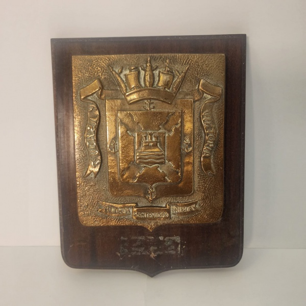 • Brasão decorativo de parede com placa de Bronze em relevo aplicada sobre base de madeira. A peça apresenta símbolos navais e inscrição Armada Montevideo Uruguay, com composição rica em detalhes e estética clássica militar.                                                          Estado de conservação: bom estado geral, com marcas naturais do tempo na madeira e leve pátina no metal, preservando seu caráter original. Medindo: 24x19