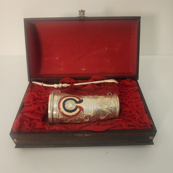 • Conjunto composto por cuia em metal ricamente decorada em relevo, acompanhada de bomba metálica, acondicionado em estojo de madeira com interior revestido em tecido vermelho. A cuia apresenta acabamento trabalhado com motivos ornamentais e detalhe esmaltado em cores, conferindo caráter cerimonial e comemorativo à peça.                    Estado de conservação: bom estado geral, com sinais naturais do tempo no estojo e leve pátina no metal, sem comprometer a integridade do conjunto. Medindo: 11x27x15O