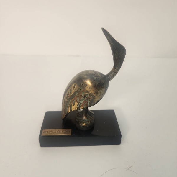 • Escultura decorativa em metal representando garça estilizada, produzida pela marca Diplomat, conhecida por peças ornamentais voltadas a ambientes corporativos e residenciais. A base apresenta placa Brasilcred Seguros, empresa brasileira do setor securitário fundada na década de 1990, indicando origem institucional ou comemorativa.                  Estado de conservação: bom estado geral, com marcas superficiais compatíveis com o tempo. Medindo: 14x6x10