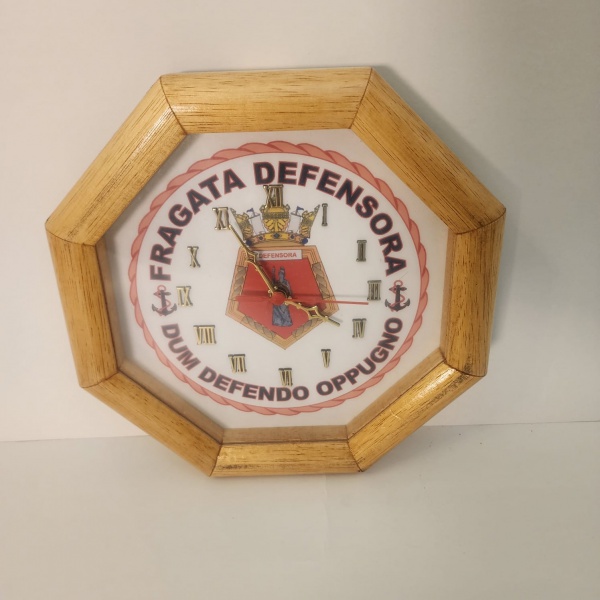 • Relógio de parede com temática naval, trazendo no mostrador a inscrição Fragata Defensora  Dum Defendo Oppugno e brasão militar centralizado. Peça de caráter institucional, vinculada ao ambiente naval. Fabricado pela Annida Relógios, marca brasileira ativa nas décadas de 1980 e 1990, conhecida pela produção de relógios promocionais e corporativos. Movimento quartz, de fácil manutenção.                                                                                      Estado de conservação: Bom estado geral, com marcas leves compatíveis com o tempo. Parte traseira preservada e com suporte para fixação. Medindo:27x27