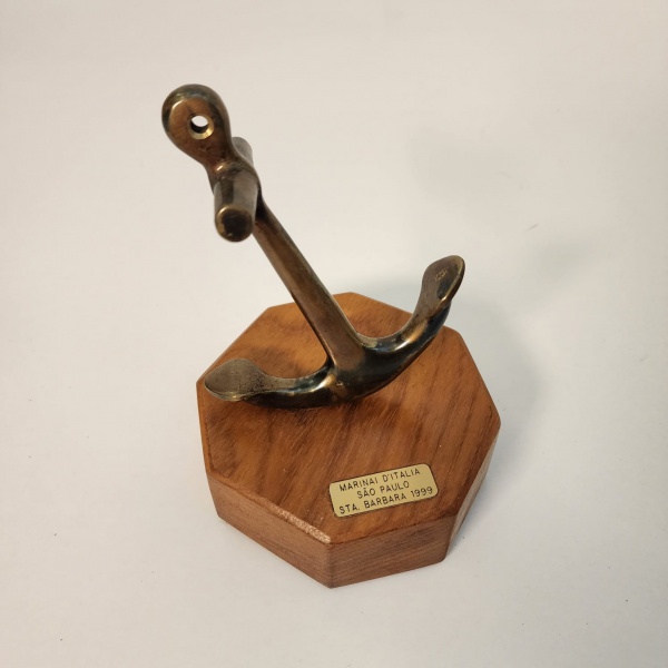 • Escultura decorativa em formato de âncora fixada sobre base de madeira. A peça apresenta plaqueta com a inscrição Marina DItalia -São Paulo- Sta. Bárbara 1999, possivelmente tendo produção comemorativa ligada a evento ou representação marítima italiana no Brasil. Acabamento com pátina natural do Bronze e linhas clássicas da simbologia naval, conferindo caráter histórico discreto e boa presença estética.                                                                         Estado de conservação: bom estado geral, com leves marcas do tempo compatíveis com a idade. Medindo: 15x11x11