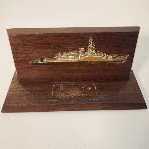 • Peça institucional náutica composta por base em madeira maciça com aplicação metálica representando embarcação. A presença de marca retangular na base indica que originalmente sustentava uma placa comemorativa ou de identificação, característica comum em homenagens ou reconhecimentos no meio naval.                                                     Estado de conservação: Bom estado geral, com sinais leves de uso e marca visível onde havia a placa original, sem comprometer a integridade da peça. Medindo: 9x19x8