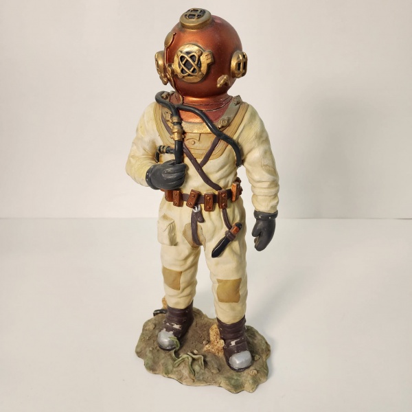 • Estatueta representando mergulhador escafandrista clássico, equipado com traje de mergulho pesado e capacete metálico estilo cobre, inspirado nos modelos históricos utilizados em operações submarinas. Peça rica em detalhes, com mangueira de ar, cinto de equipamentos e base temática remetendo ao fundo do mar.