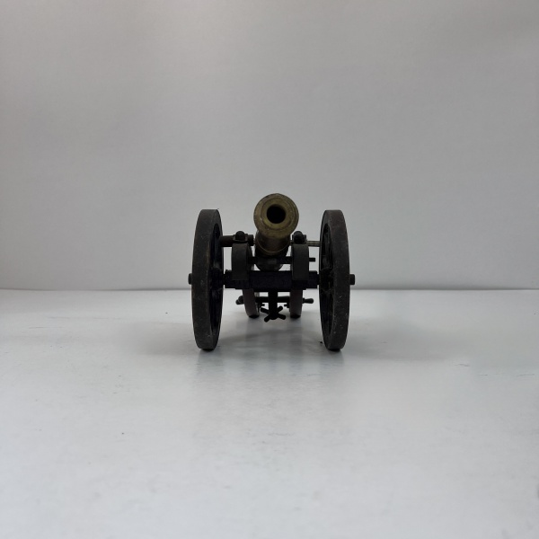 • Miniatura de canhão decorativo, composta por estrutura em madeira com ferragens e rodas em metal, e tubo em bronze com acabamento envelhecido.Peça rica em detalhes, apresentando elementos simulados de funcionamento, como mecanismo de elevação e base com parafusos, remetendo a modelos históricos de artilharia.