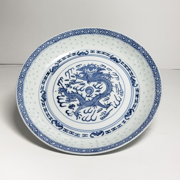• Conjunto composto por 6 pratos fundos em porcelana, com decoração em azul e branco, apresentando figura central de dragão em estilo oriental, cercado por elementos geométricos e padrões tradicionais.