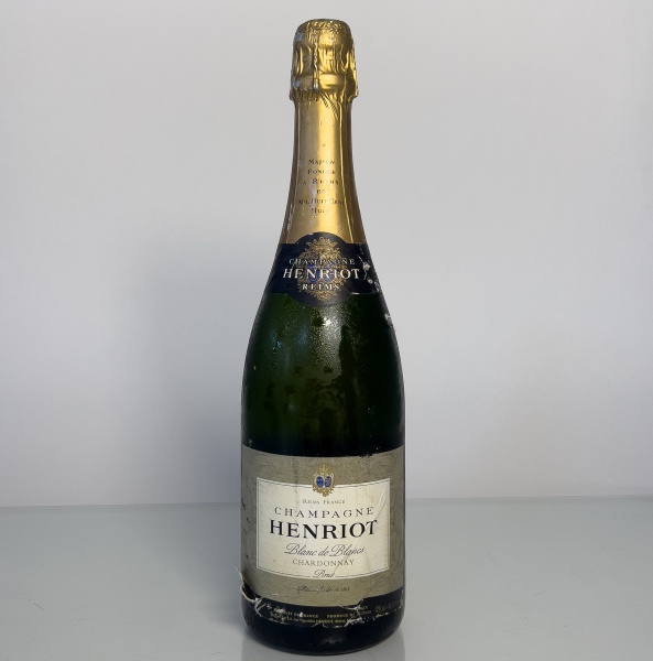 • Champagne francês Henriot Blanc de Blancs Brut, elaborado exclusivamente com uvas Chardonnay da região de Reims. Garrafa de 750 ml, rótulo clássico com sinais de uso e desgaste pelo tempo, mantendo o charme de peça mais antiga. Perfil elegante e refinado, típico dos champagnes Blanc de Blancs.
