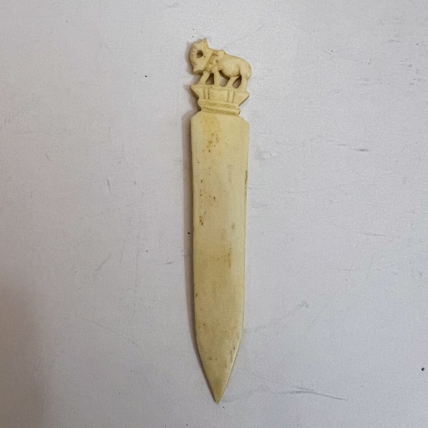 • Abridor de cartas confeccionado em marfim esculpido, com lâmina alongada e ponta afilada. O topo apresenta escultura de elefante sobre base ornamental, motivo tradicional em peças orientais e indo-coloniais. Medindo: