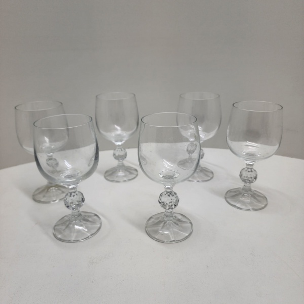 • Conjunto composto por 6 taças para vinho branco em cristal transparente, todas com corpo liso e haste ornamentada por esfera facetada, detalhe clássico de lapidação decorativa. Base com leve faceteamento radial, produzindo discreto brilho sob a luz. Dimensões:15 x 7 centímetros.
