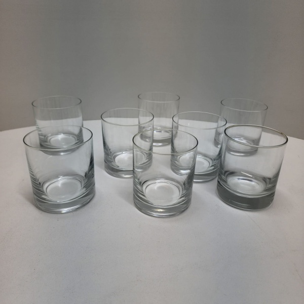 • Conjunto composto por oito copos baixos (old fashioned) em demi-cristal transparente, com paredes espessas e base trabalhada em rebaixo circular. Peças de brilho límpido e excelente sonoridade, próprios do cristal semichumbado. Ideais para whisky, drinks ou serviço de mesa refinado. Dimensões: 9 x 8 centímetros.