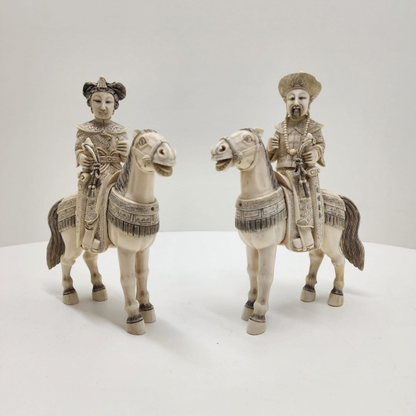 • Par de Esculturas em Marfim Dinastia Qianlong (17361795).Par extraordinário de esculturas esculpidas em marfim, apresentando refinamento técnico e precisão artesanal característicos das obras Qianlong da Dinastia Qing. As peças exibem veios orgânicos acentuados, tonalidades acinzentadas próprias de marfim antigo e fissuras naturais resultantes do envelhecimento secular do material, elementos reconhecíveis em exemplares históricos de elevada antiguidade. O detalhamento minucioso revela domínio excepcional da técnica de entalhe: vestes com frisos delicados, texturas profundas, volumes harmoniosos e ornamentação rica em motivos simbólicos típicos da estética imperial do século XVIII chinês. A pátina madura, distribuída de forma irregular, acentua a autenticidade visual do marfim trabalhado ao longo de séculos. As bases apresentam selos em escrita zhuanshu, remetendo às marcações tradicionais relacionadas ao universo artístico e cerimonial da corte Qing. Dimensões: cada 22 x 20 x 6 centímetros.