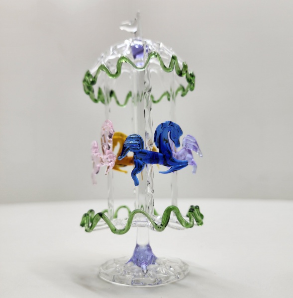 • Carrossel em vidro artístico Murano Delicada escultura em vidro artístico de Murano, representando um carrossel com cavalos coloridos, executada com notável precisão artesanal. A estrutura translúcida é adornada por bordas onduladas em verde, sustentando delicadas figuras de cavalos em tons de âmbar, lilás e azul, modeladas à mão com transparência e movimento fluido. A composição expressa a leveza e o encanto do vidro soprado veneziano, evocando o universo lúdico e nostálgico dos antigos carrosséis. Altura: 15 x 7 centímetros.